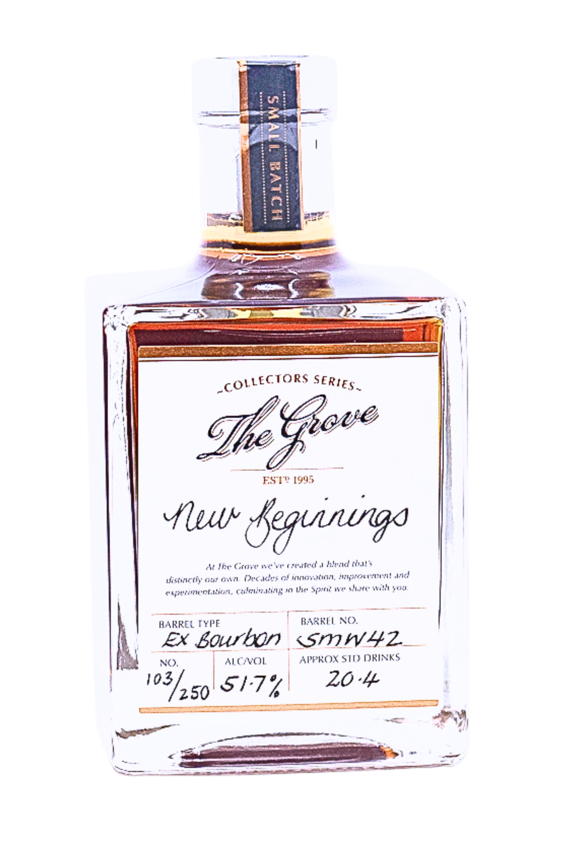 This New Beginnings Single Malt marks the start of an exciting new chapter for The Grove. Finished in a Bourbon cask, it carries warmth and depth that speaks to both tradition and innovation — a whisky crafted to celebrate where we’ve come from and where we’re headed. Drawn from a single cask and bottled without compromise, this release reflects the vision of our new Head Distiller, Shannon Grigg, and honours the moment of transformation at The Grove. Colour: Golden amber with bright copper highlights. On the Nose: Gentle warmth of cinnamon, lifted by burnt orange and hints of vanilla. On the Palate: Rich cacao and smooth vanilla roll across the palate, supported by woody undertones from its Bourbon finish. Balanced and layered, with a long, warming finish that invites you back for another sip. We are proud to share this limited release — a whisky that truly captures the spirit of New Beginnings.